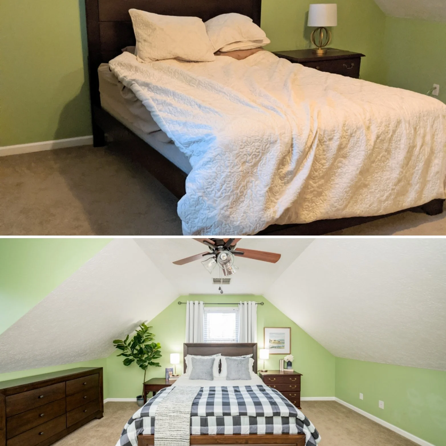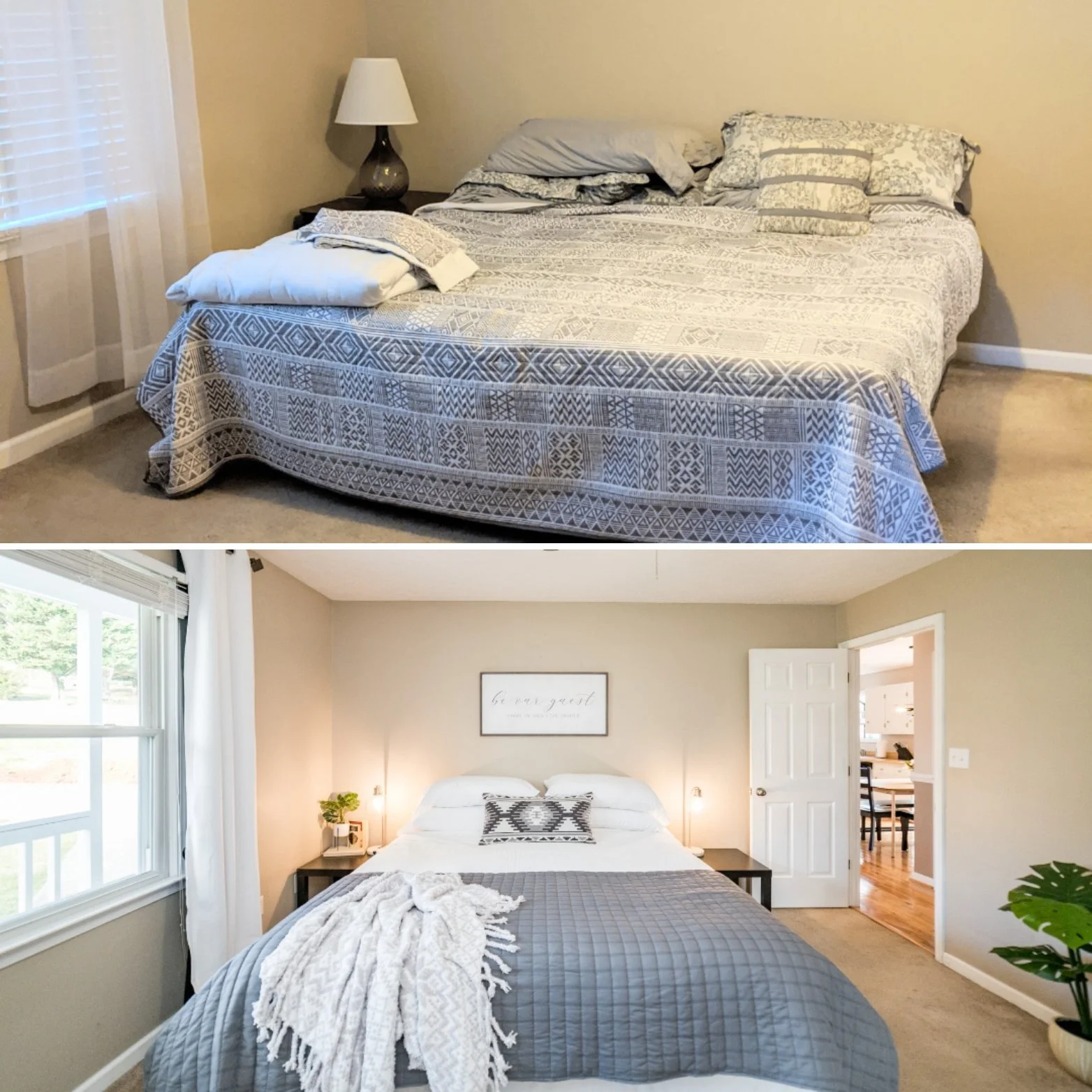The primary bedroom was looking tired itself, so we freshened it up with new bedding, lamps, & curtains. It’s been proven that white bedding communicates cleanliness to guests, and you can see how it made a huge impact on the room in the before and after below.