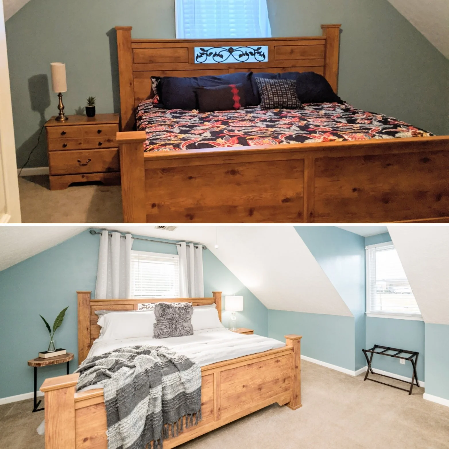 The upstairs bedrooms already had good quality furniture pieces, so it didn’t sink the budget to update to lighter colored bedding, add blackout curtains, and include a few additional accessories.