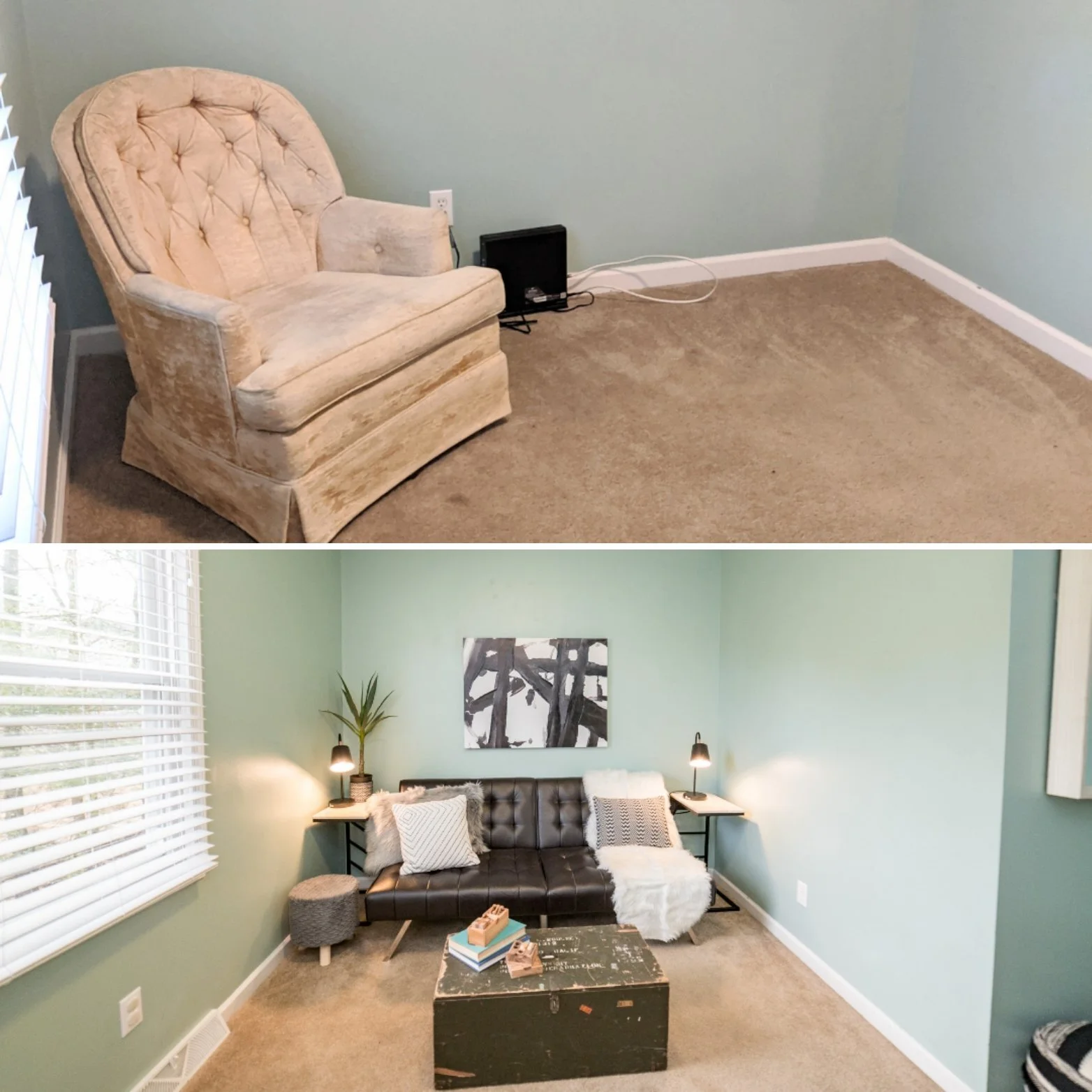 Because we knew we’d be able to use most of the bedroom furniture, we decided to splurge in the living room. The furniture was too large for the space and it was already very worn. The fake fireplace didn’t work, so we opted to create a cool focal wall behind a new green velvet couch. (pops of bold color can help listings to stand out online!) By painting the room white, it made the room instantly feel fresh, clean, and spacious. The TV moved to the opposite side of the room and we added 2 gray swivel chairs so guests can either turn towards the TV or towards conversation.